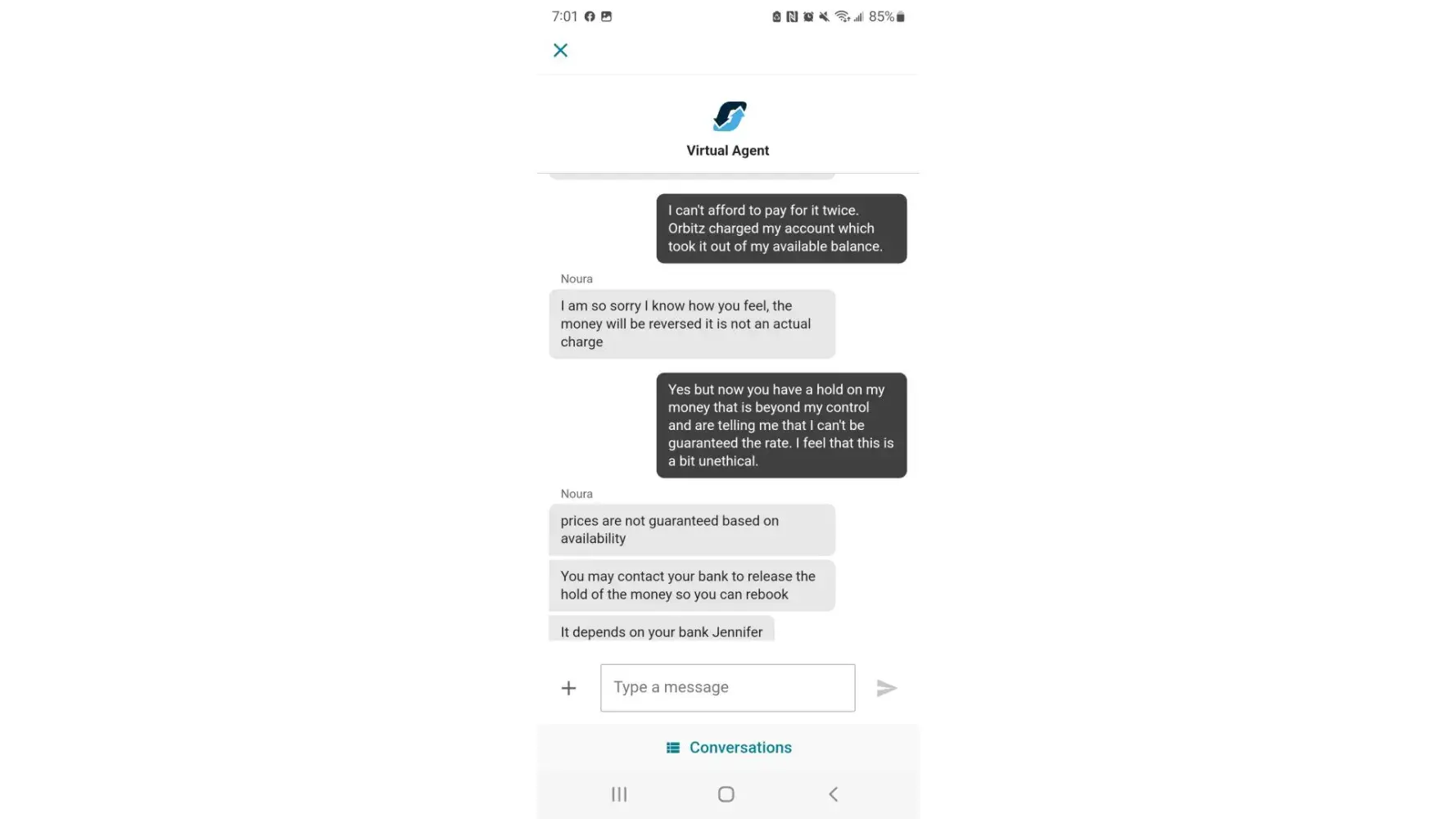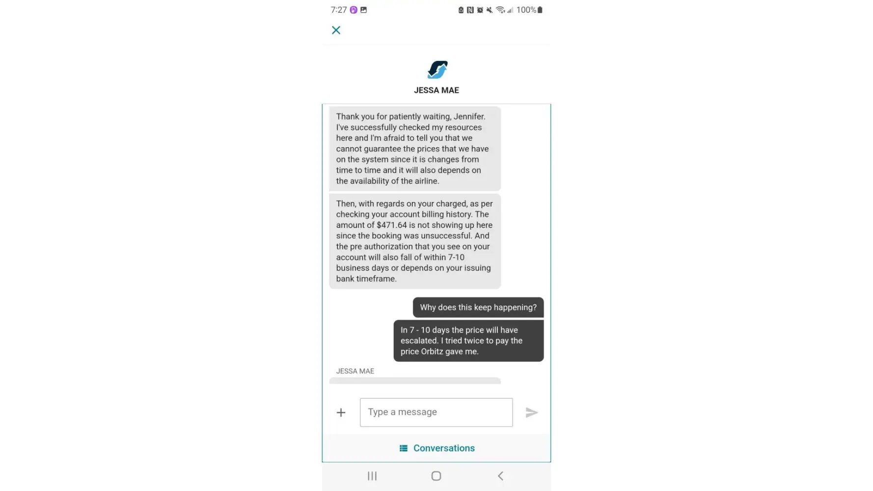 So for an error that I did not commit, Orbitz has charged me without service and then tells me that the funds will be held up for 3 to 10 days and in the same breath ask for another form of payment. What kind of foolishness is this? I should have never been charged in the first place if the prices changes and the site can't commit to a reservation>