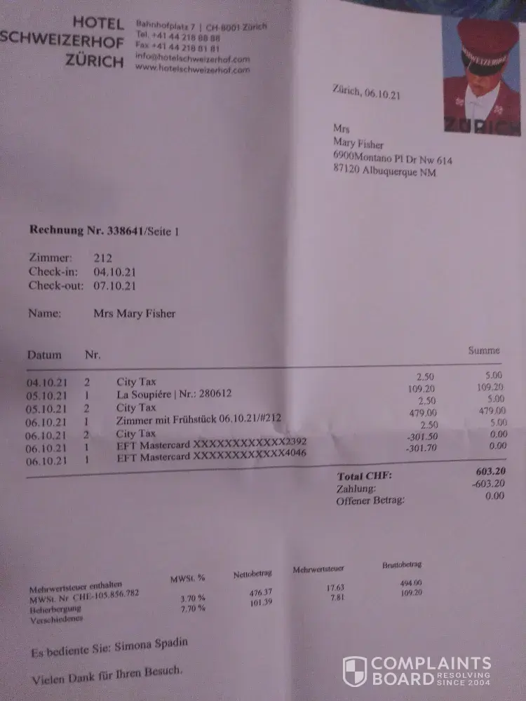 I had to pay $ 503.00 for an extra night at Hotel Schweizerhof in Zurich, Switzerland on October 6, 2021 after Orbitz messed up my booking. I asked for a refund and sent them the receipt from that hotel on 10/11/21 and was told that they would resolve the issue. I have heard nothing from them since 10/08/21.