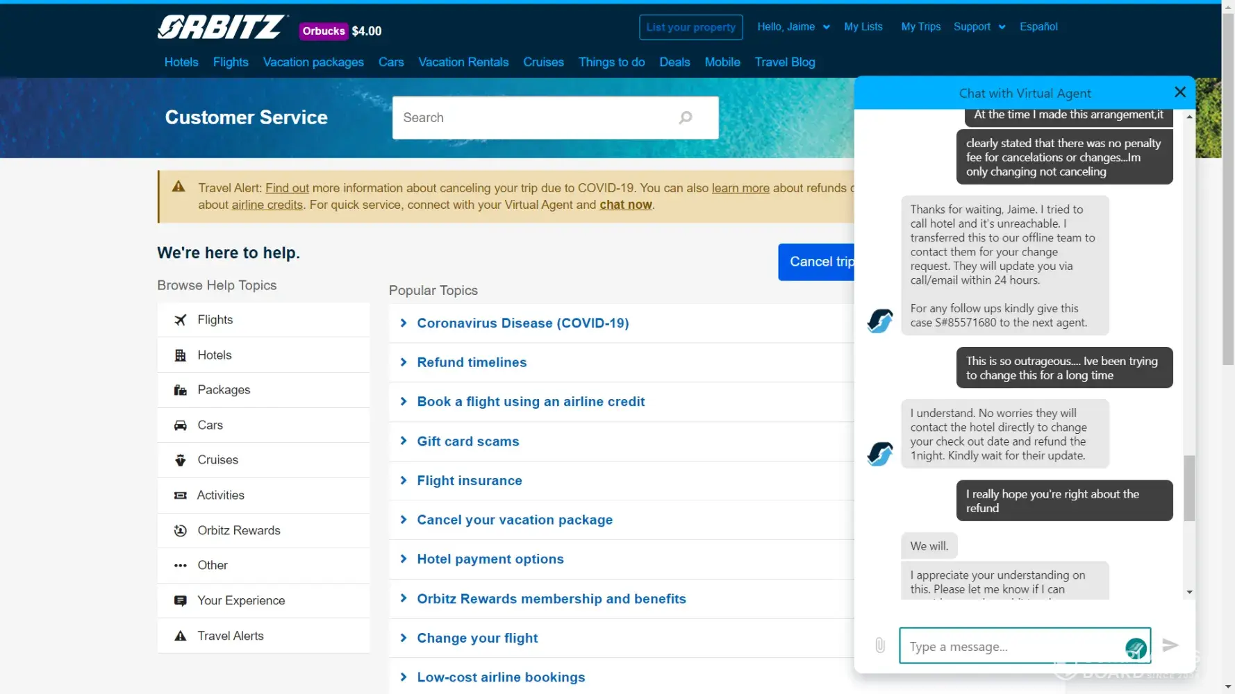 We had booked a trip to Florida for spring break 2020, and just like the rest of the world, had to cancel. Car and hotel were refunded, and we had $2800 in flight credit. We decided in March 2021 to fly to Texas because we couldn't afford Florida. After about 3 hours of hold time, we had plane tickets to San Antonio. I never received any correspondence or itinerary as to how much tickets were, but was told by the rep who booked the trip, each passenger had $326 in flight credit remaining. Our neighbors invited us to go to Cancun in June 2021. We willingly agreed to go thinking we still had some credit to use. The online feature to "use airline credits" never worked for me, so I have to call or chat each time. The first rep I spoke with via chat seemed like he was going to take care of me, but about 90 minutes into "creating new vouchers" stated that there were no United flights to Cancun on the days I wanted. (Funny though, their website showed available seats and we did fly United and did not modify the date or time.) The next week, I called Orbitz to try to book flights, and the rep told me United had deactivated the vouchers and I was to contact them to see if they were still valid. I immediately called United, spoke with a rep who referred me back to Orbitz stating they (Orbitz)may have used the entire credit for the trip we took to Texas. I then called Orbitz right back and the rep said she couldn't help me because it was an issue with United. I finally got a supervisor at United involved. She located the remaining credit that Orbitz had assigned to "Misc charge orders." On June 24th 2021 I spoke with a rep at Orbitz who did find my remaining credits. I explained to her that I have spent HOURS trying to get my credits, my Cancun vacation came and went (I am sad to say that I used Orbitz to book my flight to Cancun, paid in full, thinking that I would have received a refund) and at this point I just want my money back. She stated she cannot issue a refund but could send it to corporate for an "investigation" and I should receive an email within 24-72 hours. Needless to say, its been two full weeks and I have not gotten any response. I called today to check the status and was hung up on TWICE. The third time I called I requested a supervisor and she states one will call me within 48 hours. HA. I'll hold my breath...