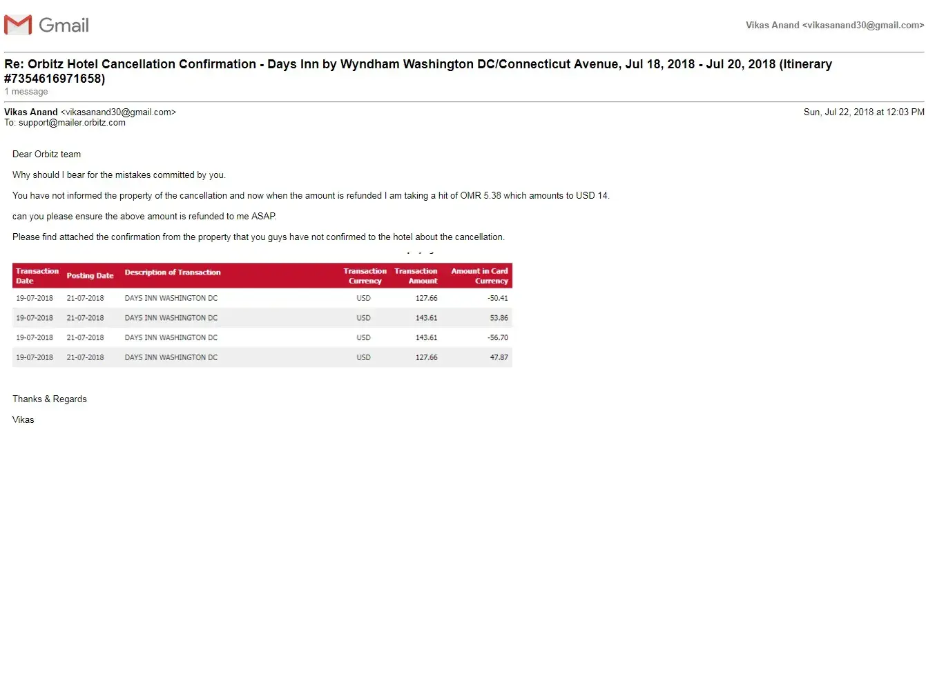 You have not informed the property of the cancellation and now when the amount is refunded I am taking a hit of OMR 5.38 which amounts to USD 14.