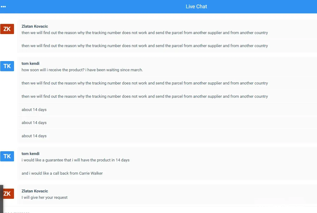 after 4 months, many excuses and dozens of hours frustrated trying to get customer service i still have no order. Zlatan Kovacic told me once again they would reship my order. it will arrive in 14 days. i asked to have Carrie Walker (supervisor) call me back, i believe this company is a SCAM but i will let you know in 14 days. this business has been selling products for at least 5 months that are not even getting shipped. the business needs shut down until they correct the matter.