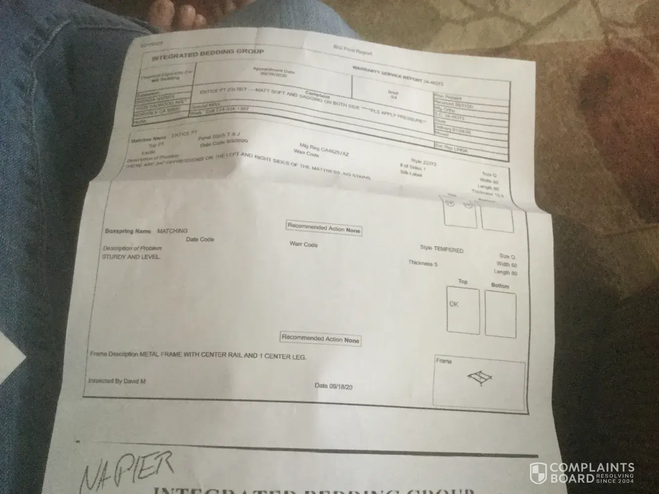 My name is Brenda Speciale-Napier, in January 2020, I started looking for a much needed mattress. I purchased a mattress from Ortho Mattress in Cerritos California on Jan 19th (Entice PT Mattress). Invoice # 34-46373. On January 24 the mattress was delivered. With in 3 months the mattress started to cave in on both sides. I contacted Ortho and they sent out a inspector from Integrated Bedding group on September 18. It was noted he found the mattress has caved in by 3/4 inch. On September 25th I received a denial letter stating the warrant only covers it if the bed is 1inch or more defective. I mailed a letter to the CEO Kenneth Karmin regarding my complaint. I received a phone call from Letty at the Cerritos Ortho location. She agreed and said she would replace the mattress with a new and gave me a complete credit. All I had to do is go pick one out for the same price or pay the difference for a new one. And so I did! On October 15 a delivery of my new mattress, they brought in my house a mattress that was wrapped the same way he wrapped my old mattress. Was I really getting a new one, or was it used? I've bought many mattresses in my life, and they have all come sealed in plastic, not wrapped and taped, like this one did. The delivery company came and wrapped my old mattress in plastic, and took outside. The delivery guy told me there was a stain on it, I requested him to unwrap it and let me inspect it, he said no and there's nothing he can do. I needed to call Ortho and tell them. I called at 9:40 and spoke with Linda, she stated she could've override many because the driver said there was a stain. I requested for management to call me. At 10:04 I received a call from Letty at Ortho mattress in Cerritos, I explained to her the driver declined me seeing the stain, and I had my husband, my neighbor and myself look for this so called stain, (witch I use a very expensive mattress pad) and we couldn't find any stain. Letty said she would send another inspector out. The appointment is scheduled for Oct 20th.