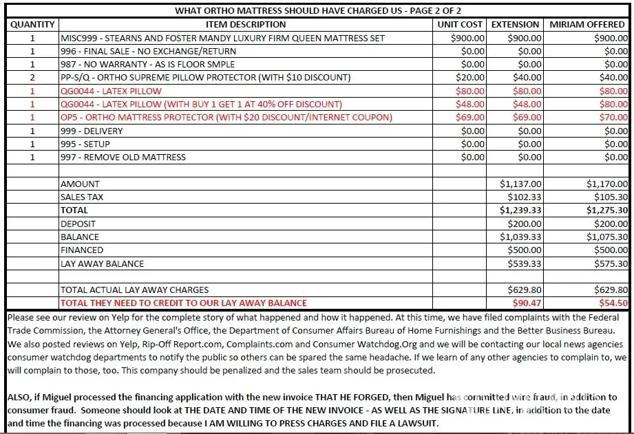 My husband and I went to Ortho Mattress at 6301 Sepulveda Blvd in Van Nuys on Saturday, June 7, 2014.This was the worst mistake we have ever made. The salesperson, Miguel, deliberately overcharged us for pillows, then he destroyed our original invoice after we left and created a new invoice without our knowledge that had different prices on it. This invoice...