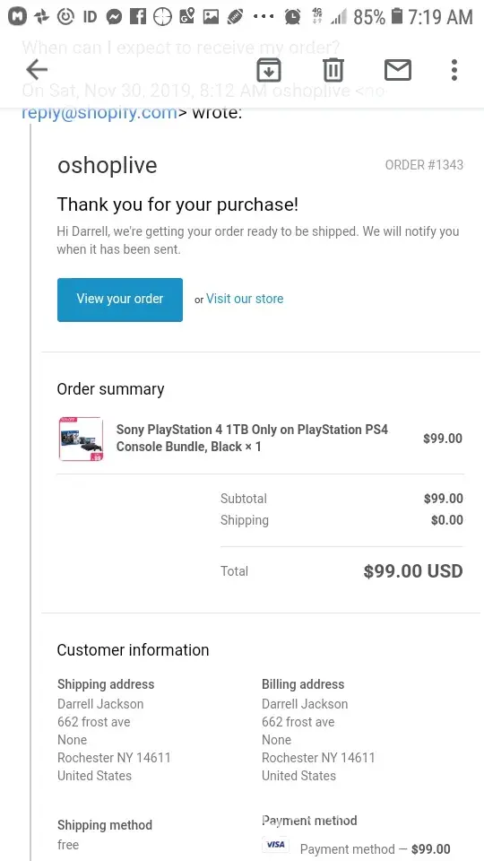 I put it in order for PlayStation 4 have not received it yet have not received any information on it yet a tracking number or anything I have been sending emails and have not had any responses back at all my order number is 1343 and I placed the order on November 30th I would like to hear something back from someone about my purchase I would like to hear something back from someone about my money if they can send me my money back because this hard times right now and I cannot afford to be losing out on a hundred bucks so please contact me about my purchase order so we can resolve the situation without having to do things legally
