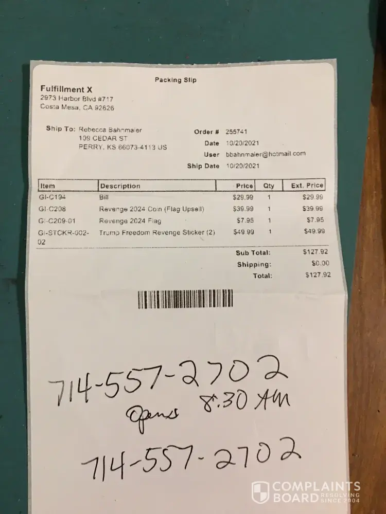 On October 17th or 18th I responded to an offer to get a free TRUMP flag. I only had to pay shipping. Well I got the flag but also received items I did not order. My credit card was billed $127.92! I found the phone number on line. I saw all the other complaints with this racketeering set up, so I felt I should report mine problem so someone can stop this. Thank you, RJB