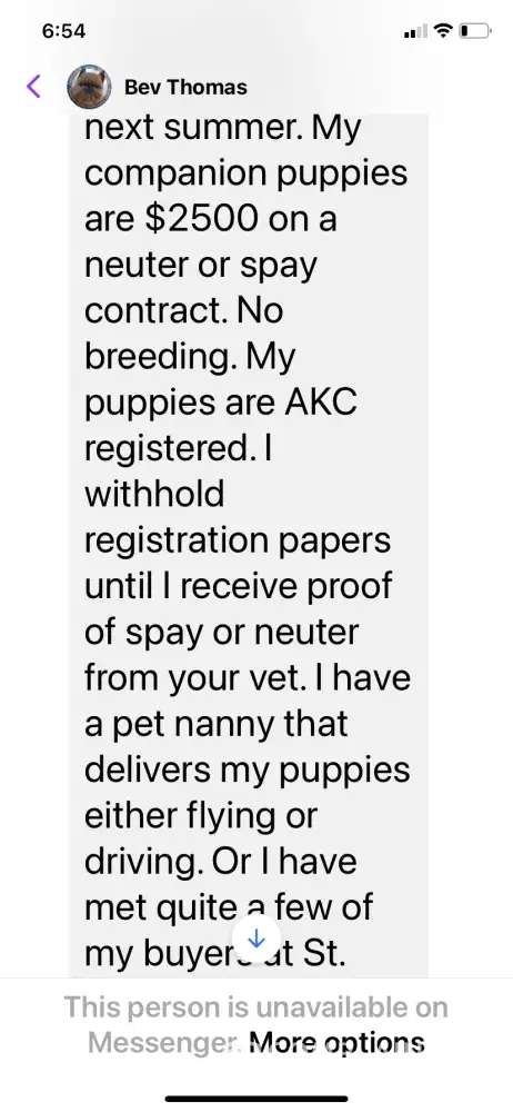 Hi, My name is Daphne Krampe. Please help me rectify this issue. I purchased 2 puppies from Bev Thomas with Mystique Brussels Griffon on Jan 29, 2021. I signed a purchase agreement on Jan 12, 2021. Her cell number is (660) 537-3177 and her email address is [protected]@yahoon.com. The puppies were born on November 16, 2020. I purchased 2 black and tan...