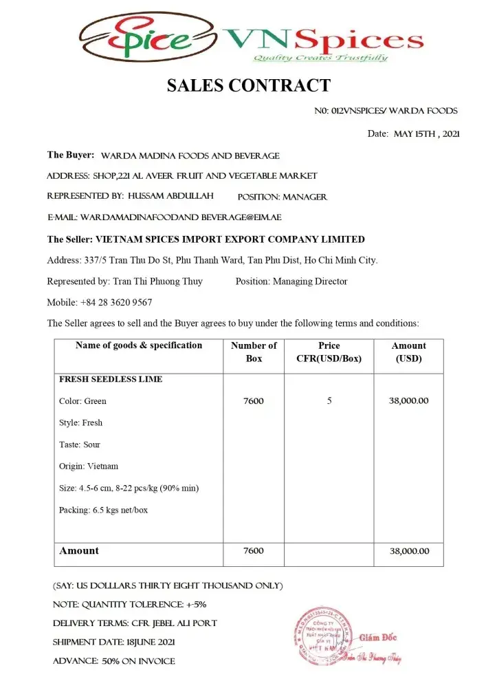 I'm Hussam from Warda Madina Food and Beverage. We had ordered fresh seedless lime from a company from Vietnam, named VN SPICES CO; LTD. There is a person by the name of Miss Julia Tran, she has cheated us and took 50% advance from the total amount and never send us the shipment. Now she is not answering our phone calls or messages. Kindly be very much...