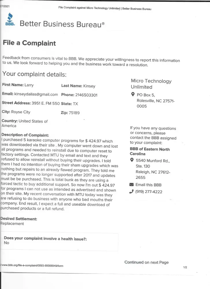 Read full complaintMTU.com - Karaoke products
