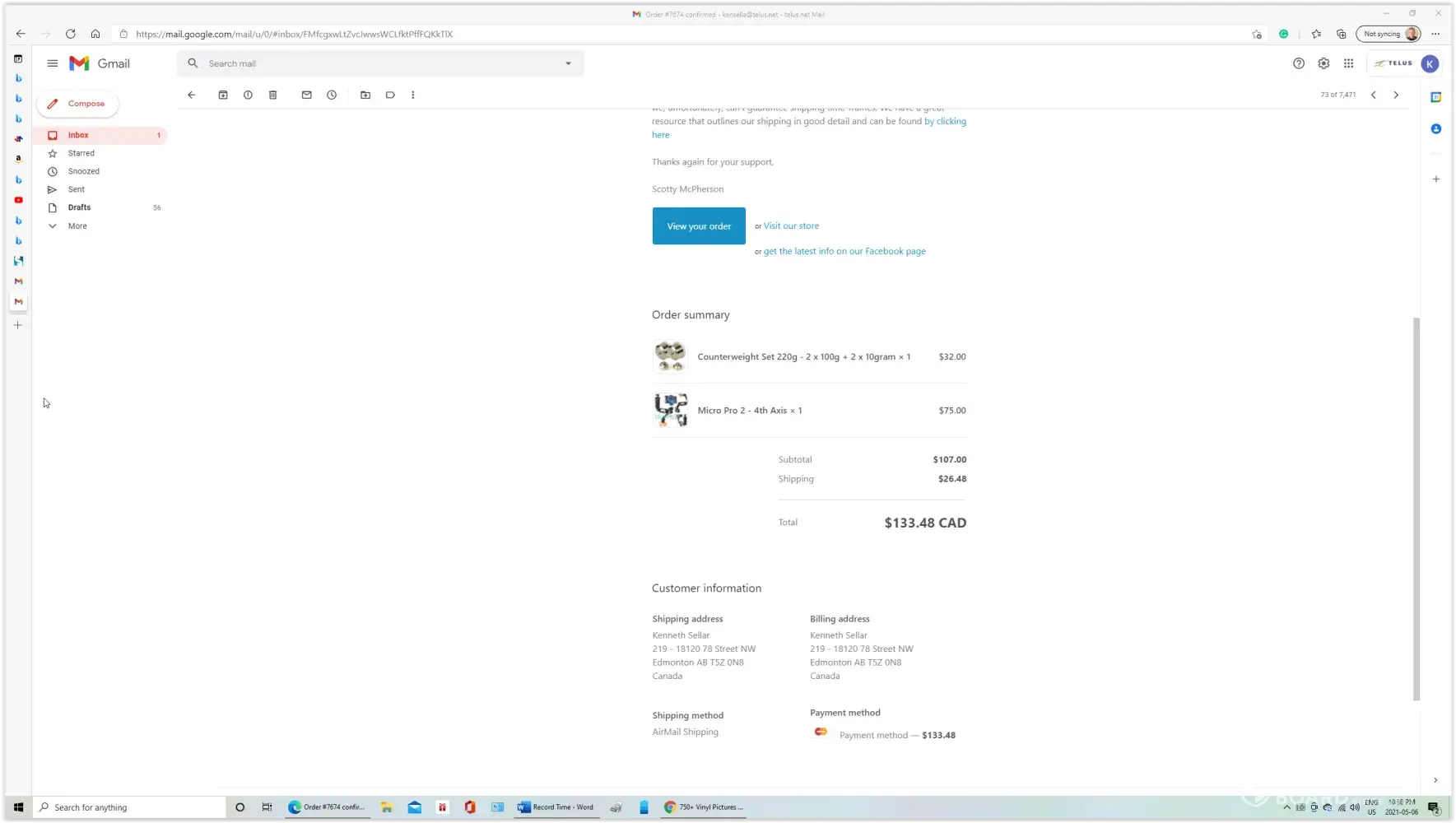 A few weeks before May 6, I ordered a Micro Pro 2 4th Axis gimbal and counterweight set from ScottyMakesStuff.com. They also have a Youtube page promoting their products. It is a gimbal to use with pocket cameras and Gopros. I received the wrong product and wrong accessories, which I made them aware of immediately. Realizing their mistake, in an email they...