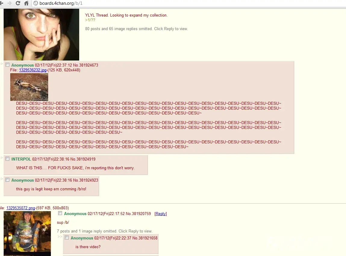 There is quite a lot of disgusting images to this nature on /b/ This is something very serious you need to check out... I can't stop shaking after seeing them and I am feeling very depressed and angry Is there no law on the internet??? I'm very angry -- there are levels and differences between things, levels of illegality and differences in tastes or sexual...
