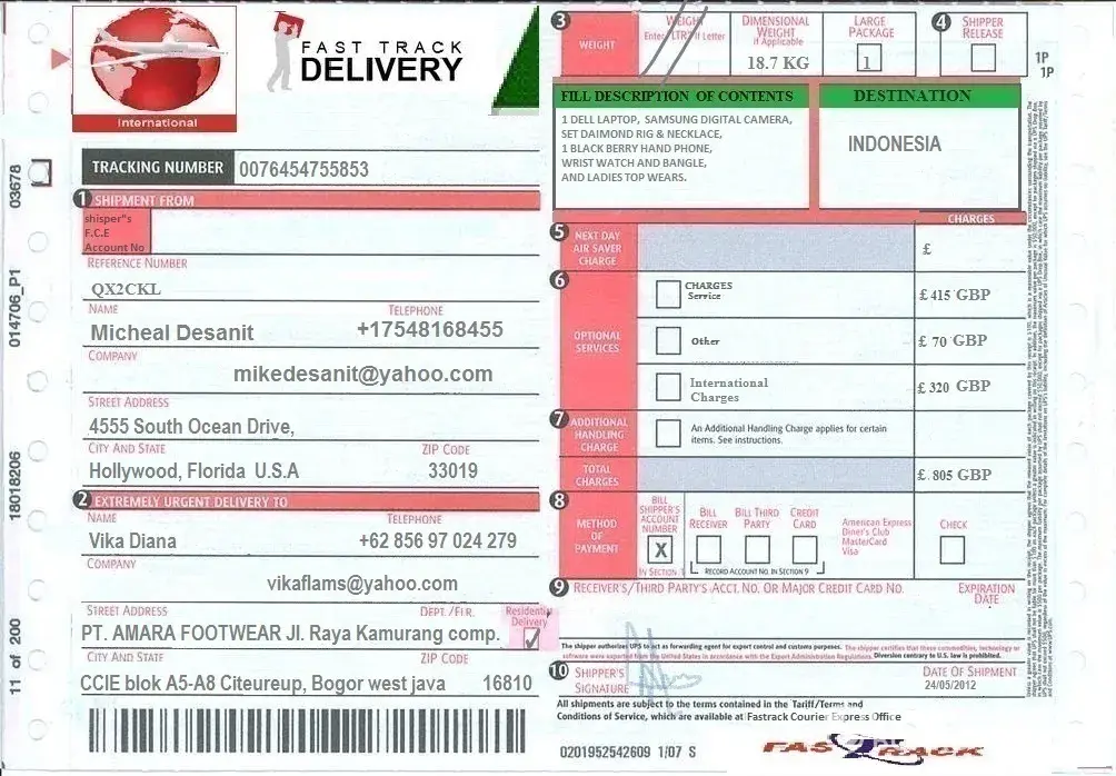 i know a man 1 month of may 2012, his name MICHEAL DESANIT, he from 4555 south ocean drive, hollywood, florida, USA 33019, his phone number +[protected] ([protected]@yahoo.com), he send me parcel and content it : 1 dell laptop, samsung digital camera, set diamond ring, necklace, 1 black berry hand phone, wrist watch and bangle, and ladies top wear...