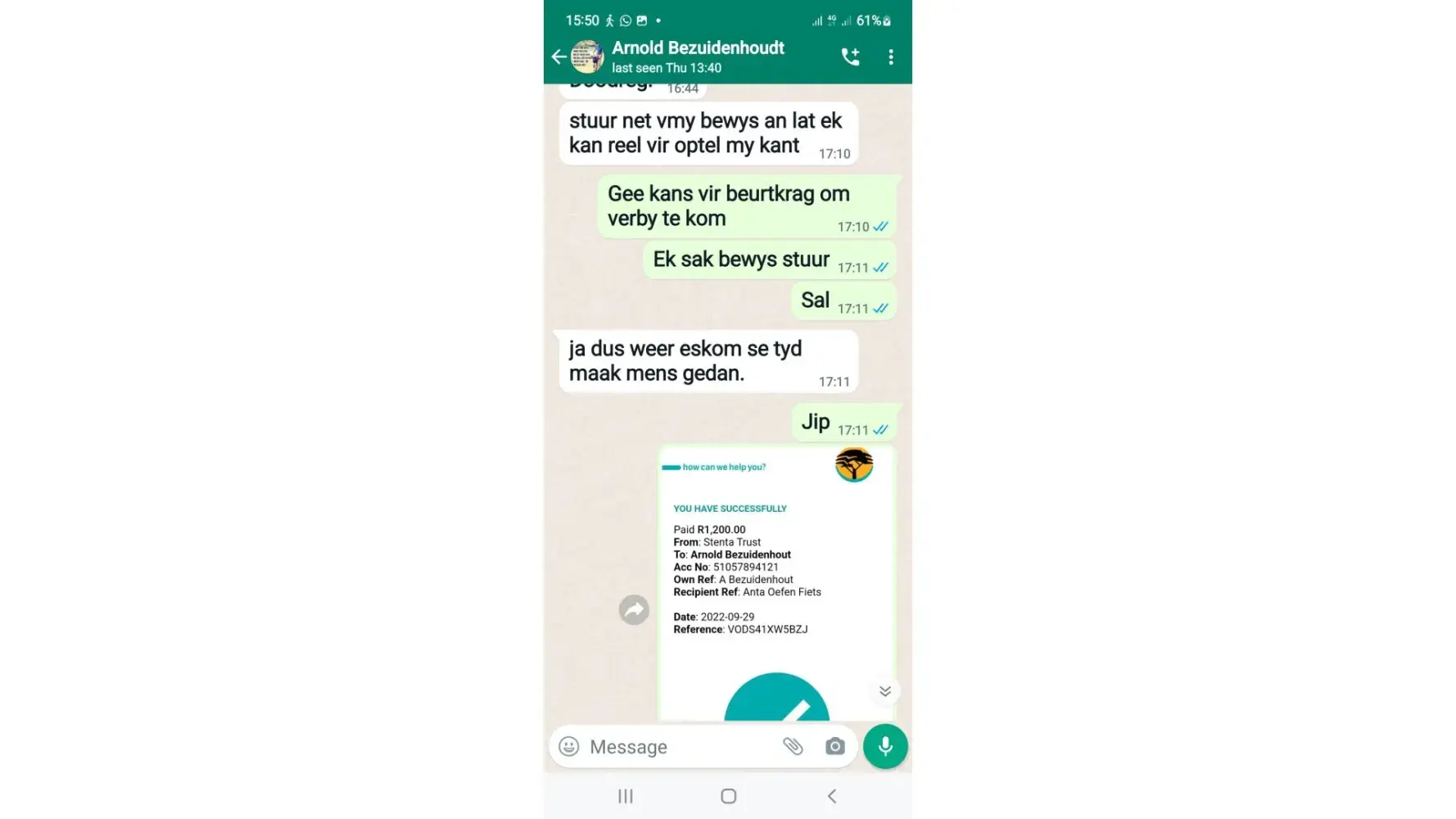 I bought a Trojan exercise bike (and paid - R1200) from Arnold Bezuidenhout of Kathu. He operates a transportation services throughout the North Cape. Also known under the name "Arrie". He banks at Tymebank, Branch no.: 678910. Savings account no.: [protected]. However, I never received the Trojan exercise bike. I have proof of everything. So it cannot be denied in any way. Be careful of this thief.