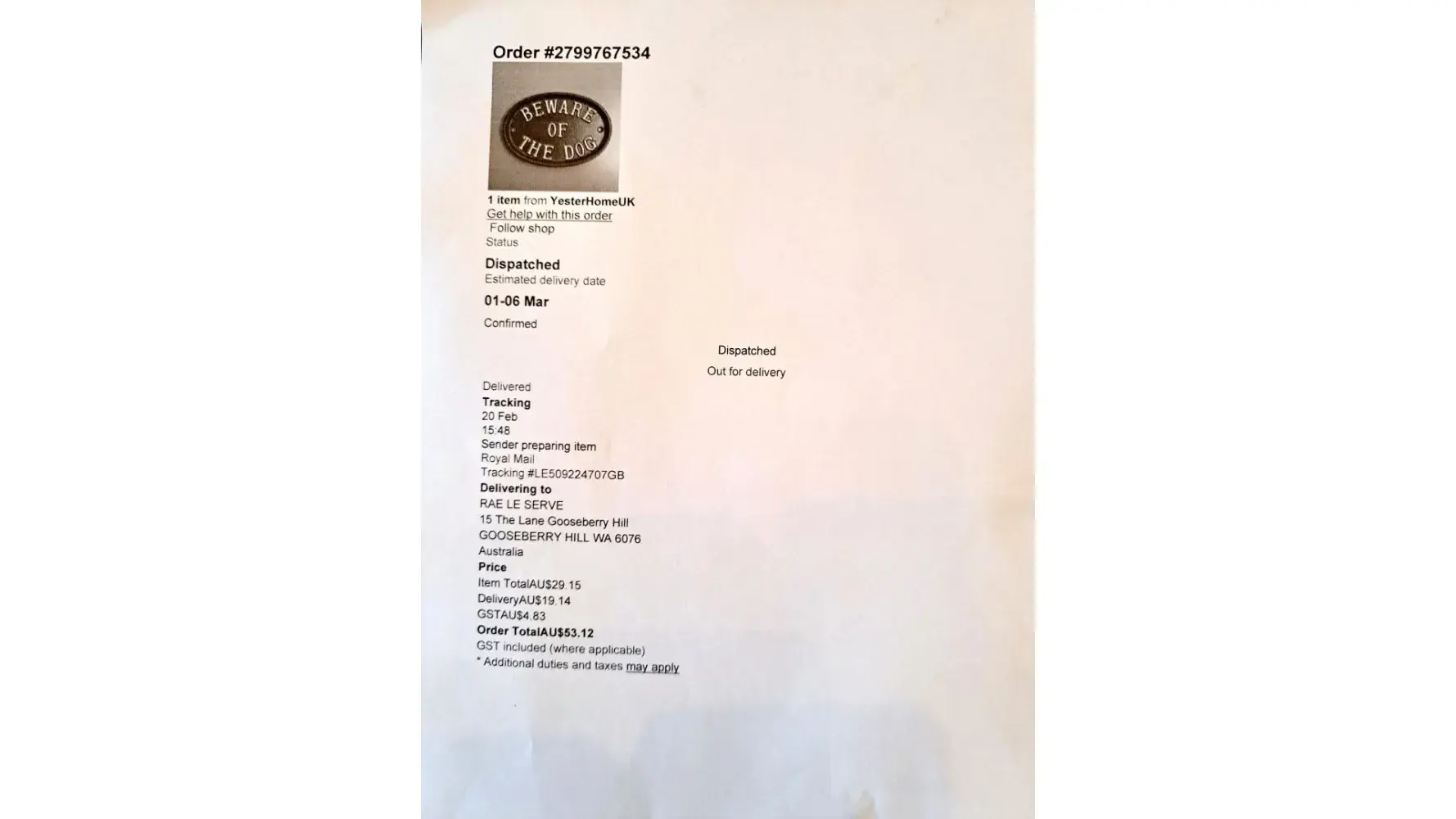 I live in Western Australia and in February ordered a 'BEWARE OF THE DOG' sign from Yester Home in the UK. It arrived after many weeks and is a 'BEWARE OF THE DOGS' sign. I only have one dog and don't want to put up the sign indicating I have more than one dog. I chose and ordered very carefully to ensure I got what I wanted. I sent four messages to Yester...
