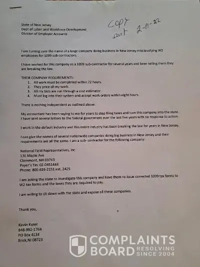 Read full complaintNational Field Representatives Inc - W2 employees classified as 1099 subcontractor