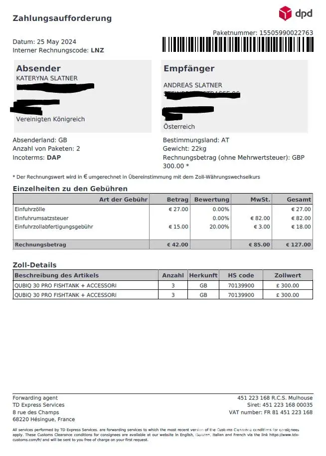 Hello, Could you please help me with the following issue regarding my parcel [protected]: I had sent 2 parcels with personal belongings (aquarium + accessories, guitar, sports gear) from the UK to Austria and the recipient (my husband) received an SMS saying we needed to pay taxes+import duties+admin fee of € 127.00 by 27/05 following this link...