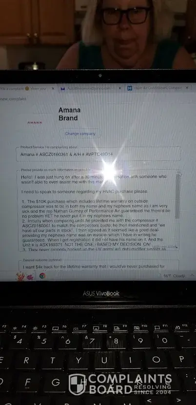 Hello! I was just hung on after a 30 minute conversation with someone who wasn't able to even assist me with this matter... I need to speak to someone regarding my HVAC purchase please. 1. The $10K purchase which included lifetime warranty on outside compressor was to be in both my name and my nephews name as I am very sick and the rep Nathan Gurney of...