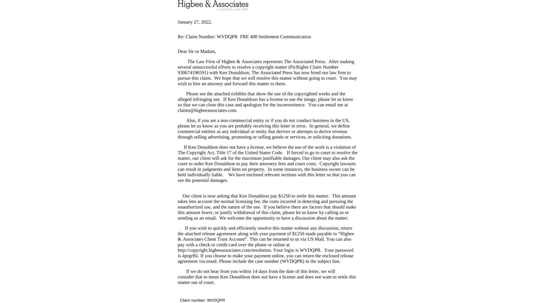 I received an email from Higbee and Associates, dated January 27, 2022, claiming that I violated copyright laws with an image I have on a blog post (since taken down) that was posted in 2016. I was under the impression the image in question was royalty-free, but I have no receipt showing such. I have had a number of correspondences with the Higbee team to...