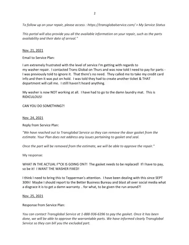 Claim #31963540 See attached summary of the ridiculous runaround I received in trying to get warranty work completed on my washing machine (purchased from Teppermans in 2016) - for over 3 MONTHS! So fed up in having to leave house and go to laundromat, I ended up having to purchase a NEW machine. Total b*s!! Even the repairman that came to house couldn't...