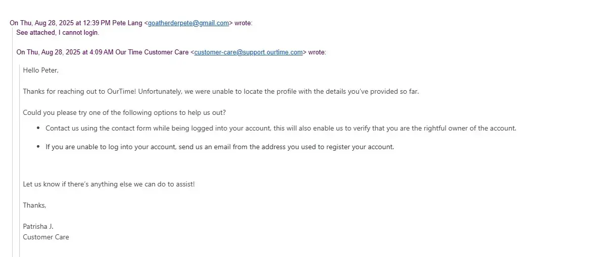 I signed up on the dating website Ourtime.com. The company charged me 22.50 on 8/19/2025. I had 3 days of glorious usage, then I could not login in with the credentials I KNEW I hade put in originally, that had worked before. I was a software engineer for 35 years and did all the standard things, change password, going in via the innumerable emails they...