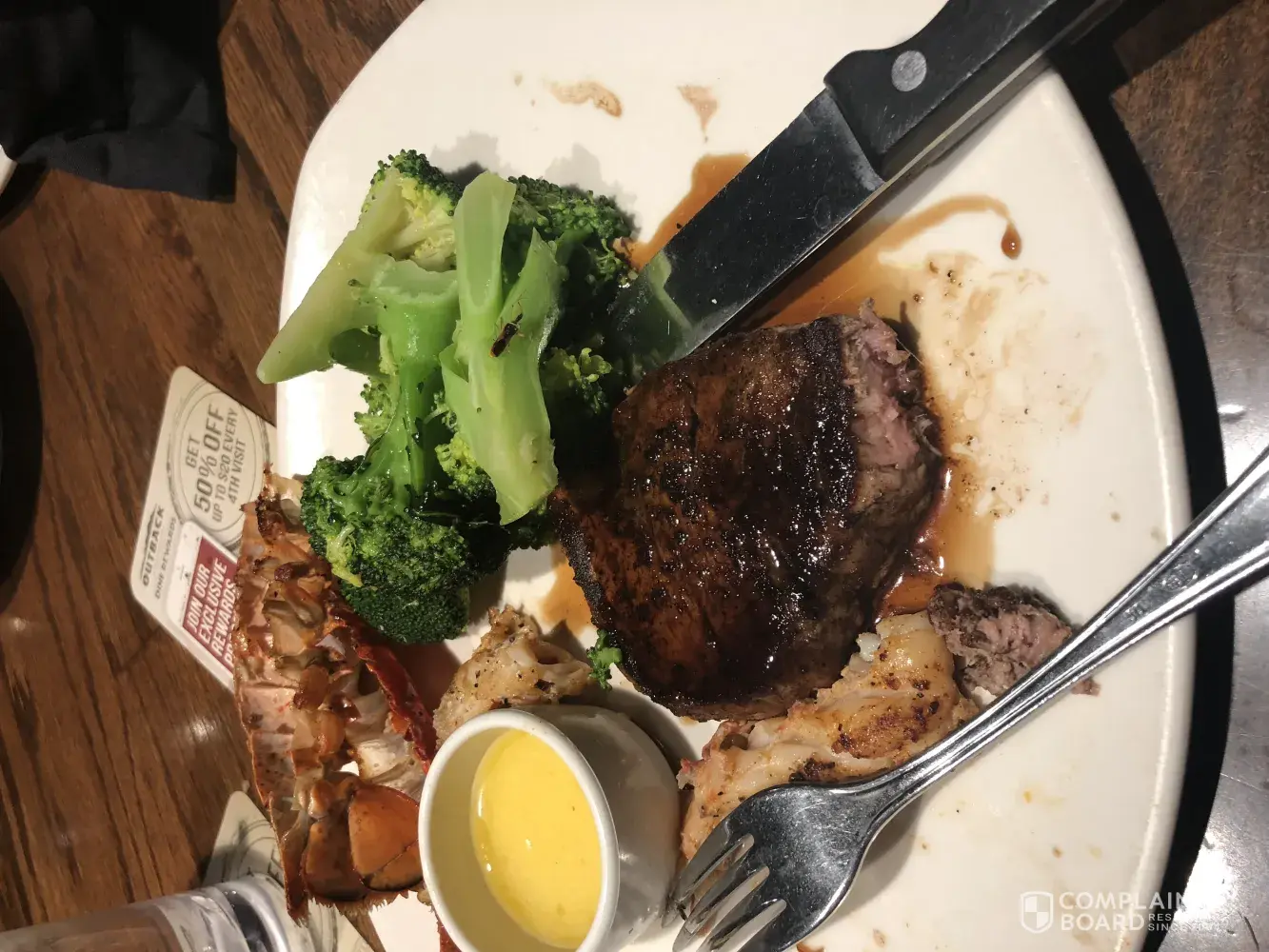 The first complaint is I had customized a steak and lobster meal spent $48/$50 just for my order, curbside pick up. When I got home no lobster call and let them know and go back to pick up my lobster when I get back they say I wasn't charged for it. Second complaint is same store order 3 point bloom pick up ribs is burnt and dry I threw away the whole platter. I don't think I will waste anymore money or time with outback at least not this location