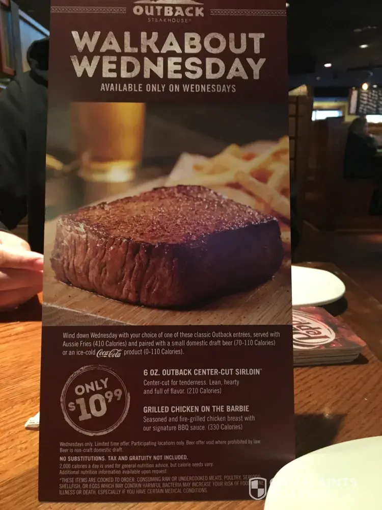 My husband and I frequent the Outback Steakhouse on 86th street in Brooklyn quite often. We decided to get one of our meals as the walkabout Wednesday which is advertised as having a 6 oz steak, fries and a small domestic draft beer. However, after placing the order we were informed that the only beer was bud light (diet). There were no other options. The advertisement did not state that the beer would be diet. Nothing was done.