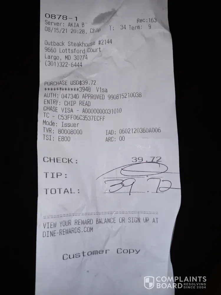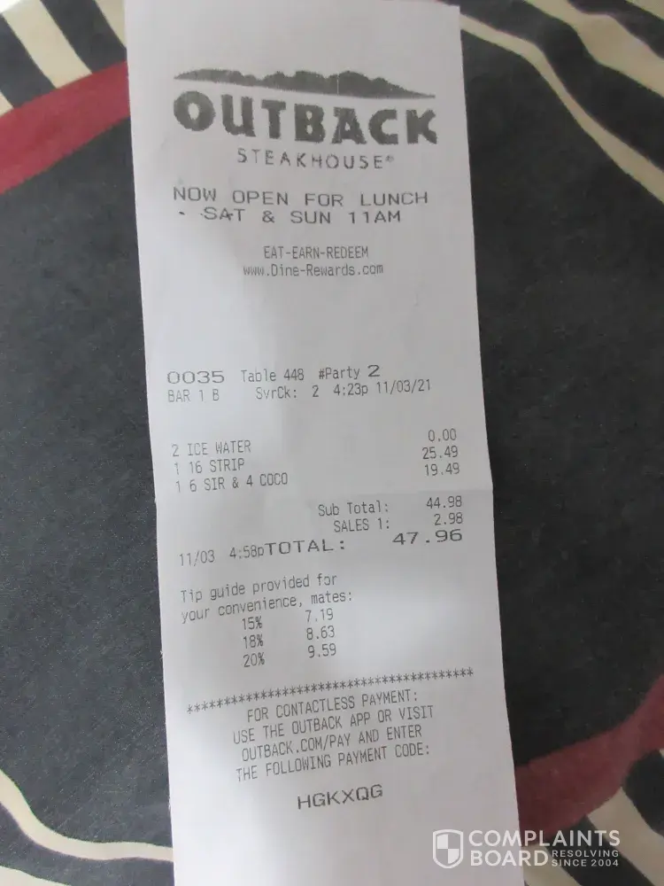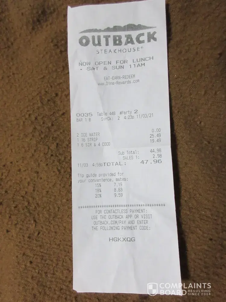 reply to [protected]@aol.com attached is the receipt for my husbands meal this service has left a bad memory of the Outback a place I used to love,