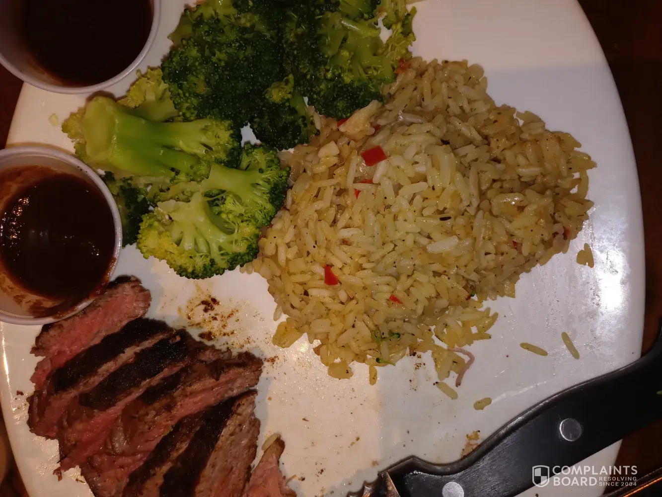 We enter the resteraurant at 7:30 pm we were placed in a booth at 7:45 pm my husband ordered a medium well steak with broccolic with mash potatoes his plate came out fine, my order was 6 oz sirloin with shrimp baked potatoe and a garden salad. The plate that was brought to me as a filet mignon steak with rice and broccolic/carrots and squash. I told this is not my food I am missing a baked potatoe my shrimp. So she brought me the bake potatoe and shrimp that were dried out and the bread underneath was hard as a rock. I requested a manager and I showed him my meal and he was shocked at my plate and the two steaks that were still raw instead of medium well. He claimed he was going to fix the order by this time my husband was done eating and I and still waiting for the manager to fix my food that I never got. The cooks and the waitress should know to bring out food that is old and to not only check the dates on food but to check the food for spoilage. Sorry I forgot to get a picture of the other steak.