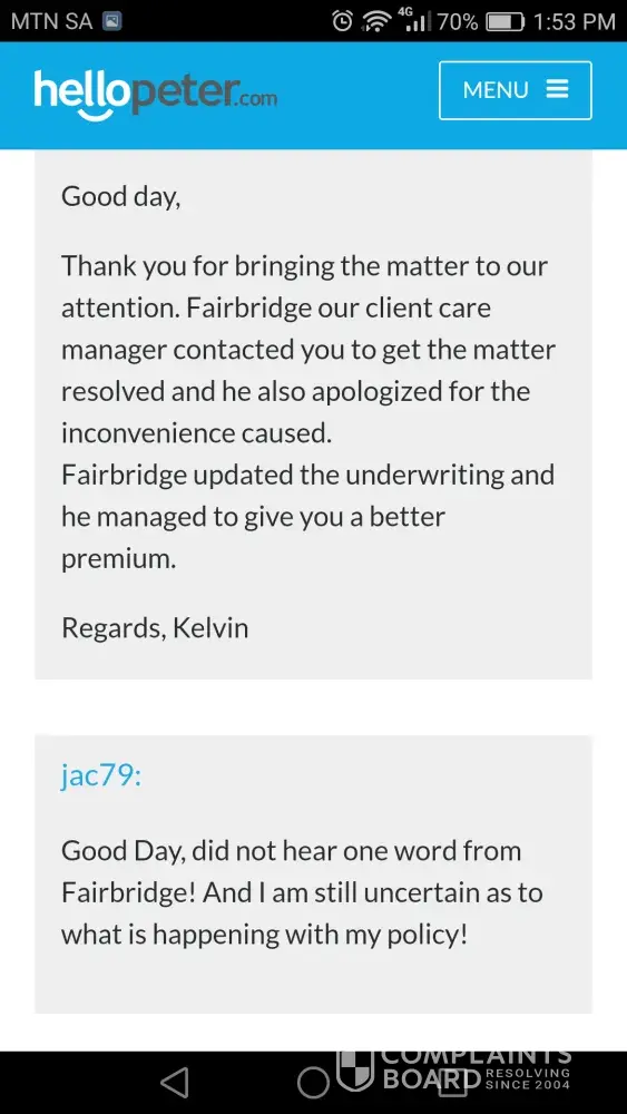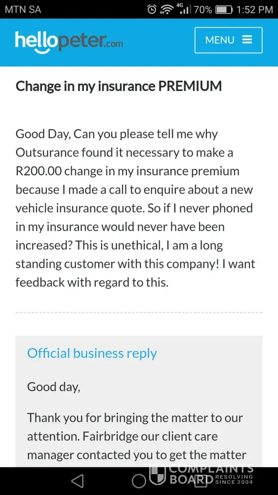 I see you are in the Outsurance complaints board or respond and investigate queries, I have a serious issue with Outsurance, since I joined in March 2002 I have not made one claim but seem to have unnecessary discrepancies everytime I need to update my policy. I have put the complaint on hellopeter and am very unhappy the way this was handled based on more lies by Outsurance, I am on the verge of canceling my policy and I feel I cannot trust Outsurance and it feels like I do not even have insurance on my car. Please see my complaint on hellopeter. My policy was changed from a Miss to a Mrs without my knowledge, who changed this? When trying to get a quote my policy went up without informing me of this! Money was deducted from my bank account. All correspondence via Outsurance is also addressed to me as Miss so that is very concerning! Now this is where I get even more angry, Kelvin stated on hellopeter that Fairbridge got in contact with me and apologised - now that is more than false, didn't hear one word from him! I still don't know what is happening on my policy and my money has not been refunded to me.