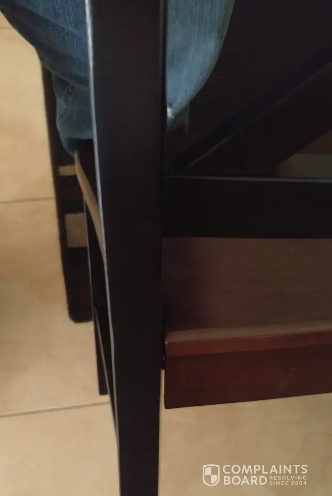These are 4 "roshan farmhouse acacia dining chairs" order # [protected], order cost was $ 276.04.. Set of 4 chairs (2 boxes of 2 each). 3 of 4 chairs were defective. I am a union (retired) carpenter (I am frank, andrea's husband) and 2 chairs are almost passable.. The one is absolutely not. The gap at the back of the stress point on the chairs should not exist, they should be tight fitting. This will lead to premature failure. Years ago, I would have made the chairs myself. The quality is not what it should be. I've posted a review & photo's already. Please advise. Photo is of the worst such gap. Your photo limitation of 5 mb. Forced me to 'crop' this photo, & unable to send other 2 (that I did post in my review, online). Thank you