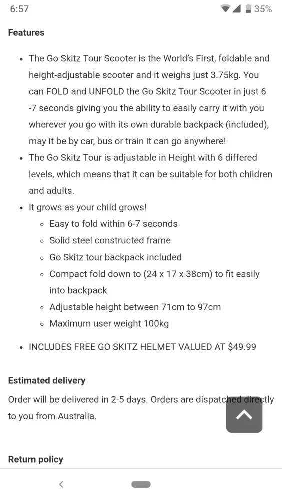 The sale stated a free Go Skitz helmet (valued at $49.99)and the item arrived without one. When I enquired about the helmet they did reply and stated the sale did not include a helmet.