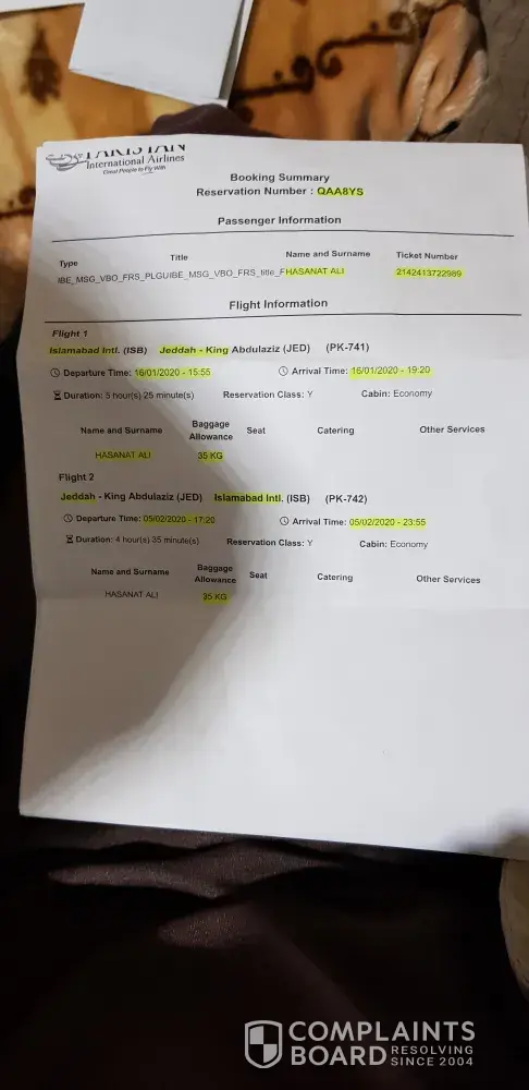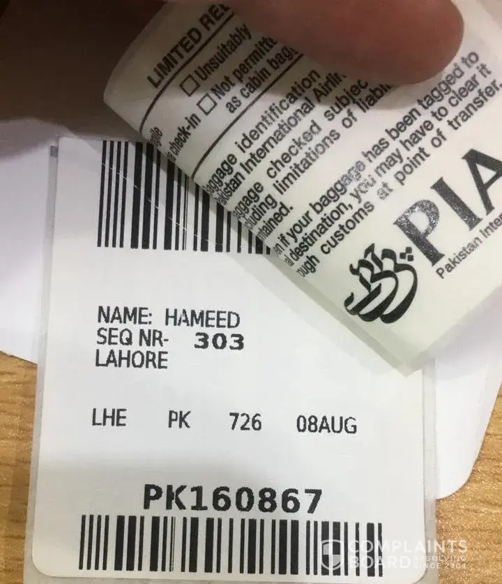 I was holding return ticket from lhe-ruh-lhe and was travelling on 8th august 2019 from riyadh to lahore by pk726. I presented two bags of 24 kg & 16 kgs. With one zam zam bottle. The pia official at the counter insisted to make both bags total 30 kgs whereas 40 kgs weight is allowed on return journey. During this dispute & insisting of the official both bags were made 16 & 14 kgs respectively. In the mean time one bag was gone through without the tag & two tags were issued to me one for my bag & other for zam zam bottle. Third tag was not issued to me despite of repeated requests to the pia official. In reply he told not to worry bag will be delivered to you at lahore airport.