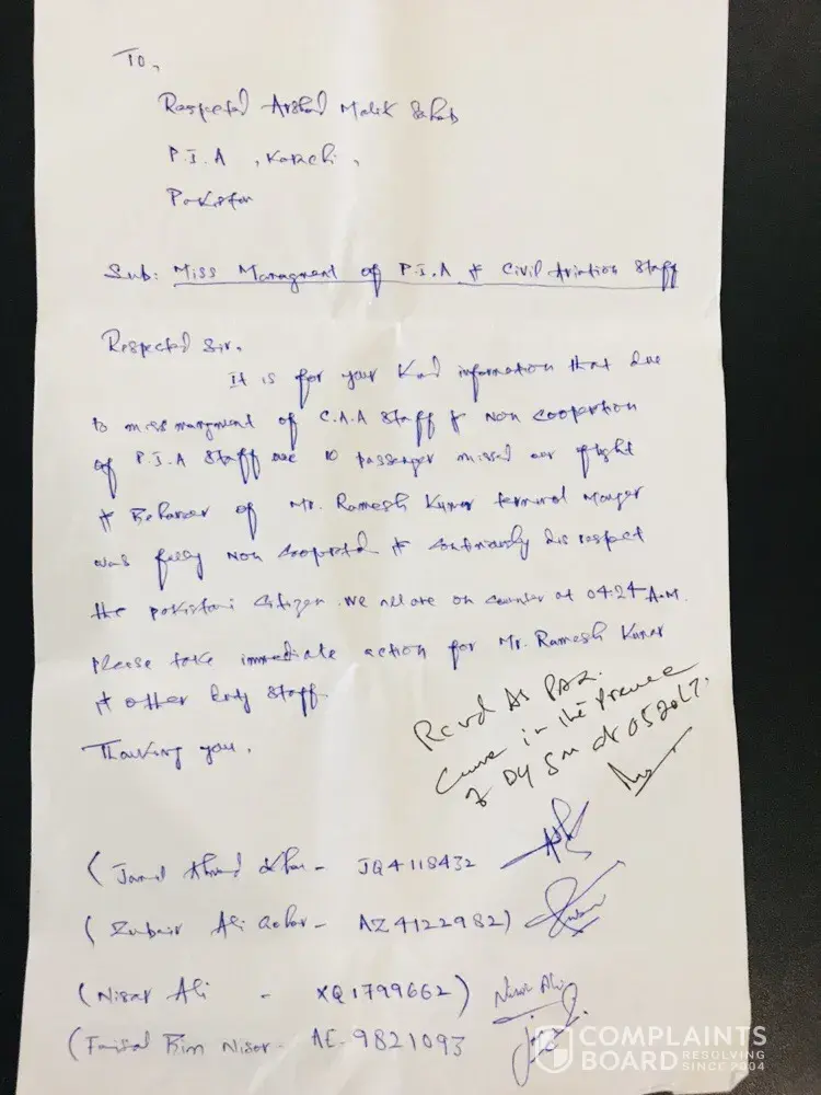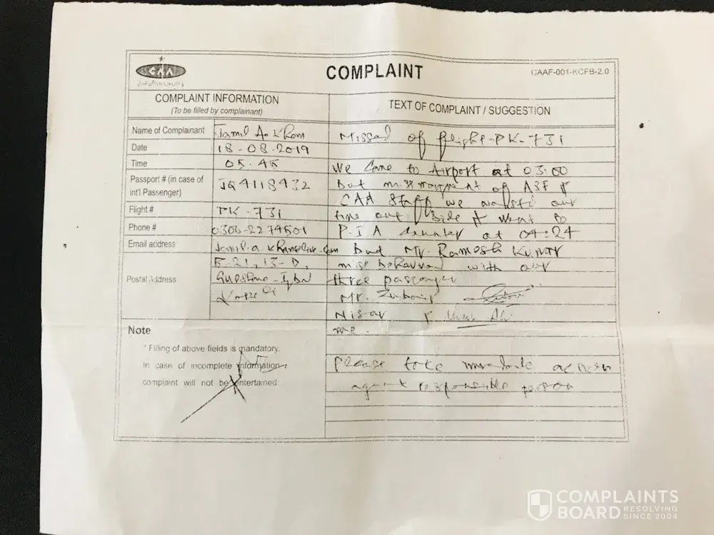 We were 10 people missed the flight, Four of us writing this complain, we wrote complain at the same time on paper and ask Mr. Ramesh to receive by himself, we further went to C.A.A and registered our complain, moreover, we met with commander Najeed of ASF (ASF on duty commander) and requested him for cooperation but no result.