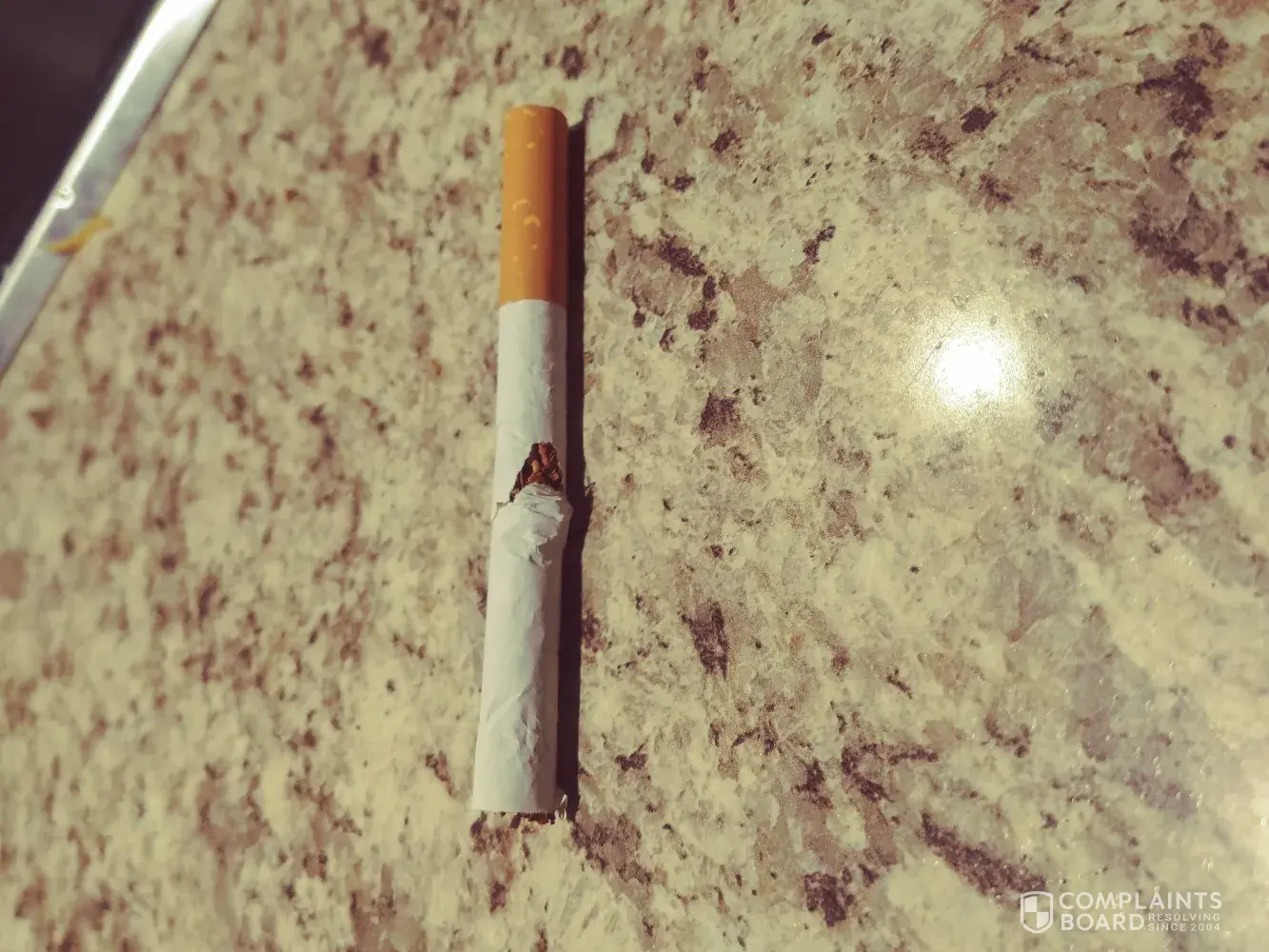I bought a pack of cigarettes tonight and when I opened them one of them was broken at the filter squished against the top of the ones beside it. I have never in my 20 years of smoking seen this happen. I can't afford to buy smokes on a regular basis so when I get my monthly income support I treat myself to a couple of packs and to have one ruined is not ok. I am not happy