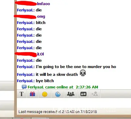 this person named FeriyaaL has made multiple accounts and began stalking me to my room and many other rooms and saying they are going to find me and murder me, they have my personal details including my address and full name. This person is relentless and does not stop harassing and threatening me, I know who they are because they began doing it on their regular account which is FeriyaaL, then they made other names and began posting my address and full name in rooms and told people to call my house and harass me, please help me