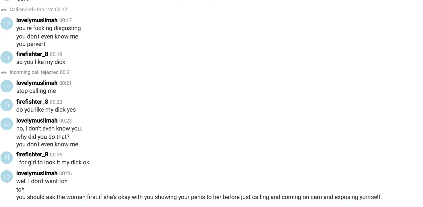 On November 4, 2019, at about 12:30 am a user of paltalk that has the nickname firefishter_8 has exposed himself on a video call after I had said no to doing any sexual activities with him. He had asked for my age and gender. Then he asked if I had a camera, when he asked that I got suspicious and I knew he might have wanted to do something sexual. So I told him in advance that I didn't want to do anything sexual. He then called me and turned on his camera while being nude and he was masturbating. I ended the call and he proceeded to ask me if he could show me himself making himself orgasm. I rejected his offer and he told me that he looks for females to expose himself to. He also confessed to exposing himself to a minor, a 13-year-old female.
