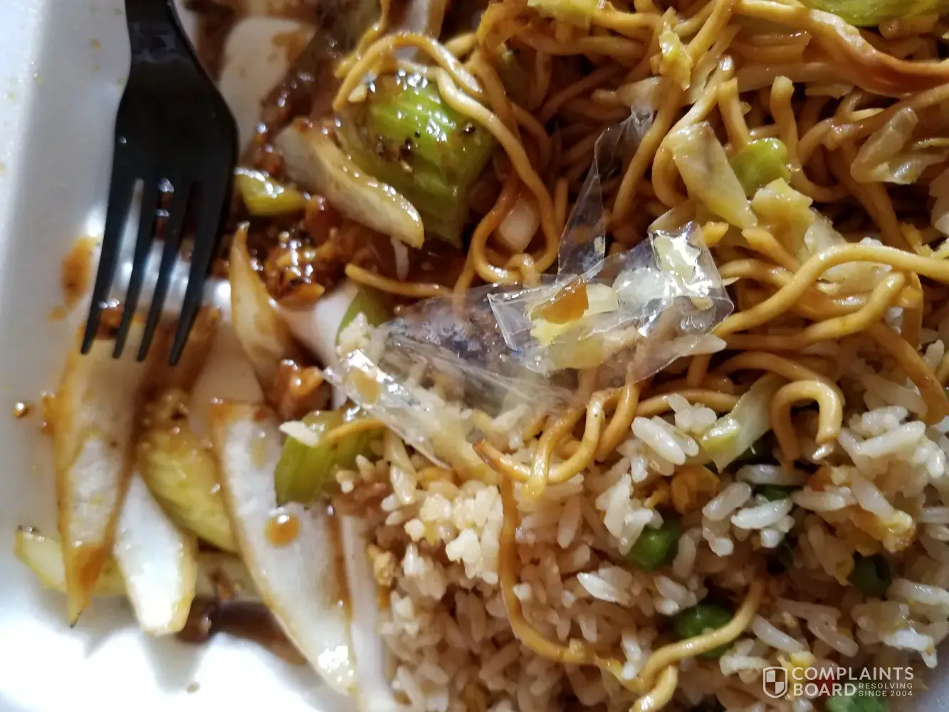 As I was eating my meal and then I found a long piece of plastic bag in my chowmein. It just makes me feel how unsanitary everything is. After seeing the plastic in my meals I just threw it out. Please talk to you employee about the importance of cleaningness. If this continues you will loose customers. Oh and I also asked the drive thru lady for a spoon and she said they don't carry spoons at the moment.