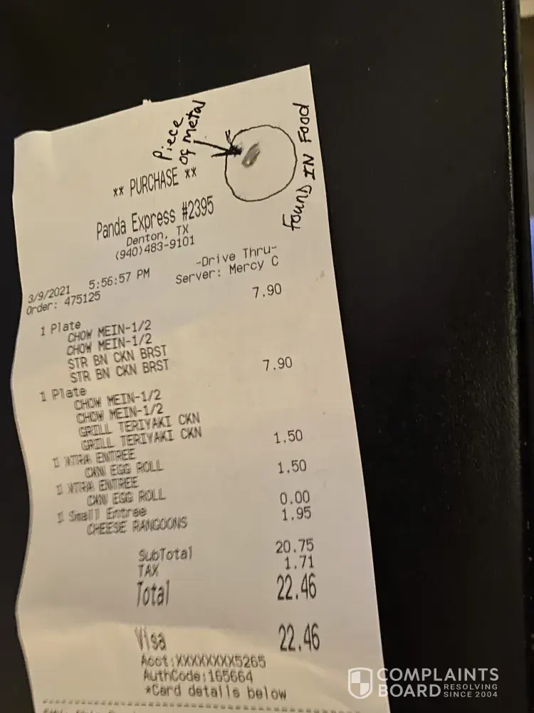 My name is Kendra Mitchell, and on February 3, 2021, I purchased Chow Mein from Panda Express at this restaurant 2187 W. Rosecrans Ave, Compton, CA 90222 and as I was eating my chow mein, and I was punctuated in my gum by a rusted cooked nail, in my chow mein. and when I called the restaurant to speak with the manager a cook by the name of Jose Navaro...