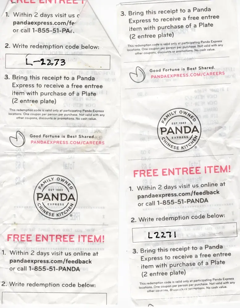 2) The counter person who prepared our food and checked us out was very loud, to the point that fixing that should be a Panda objective. I already had in hand the "free" third entree. At first she demanded I pay for it extra. As I protested that it was supposed to be free, she took it and threw in the garbage right in front of everyone. It was embarassing. With fear of further embarrasment, I had to remind her that I was entitled to a Fortune Cookie.