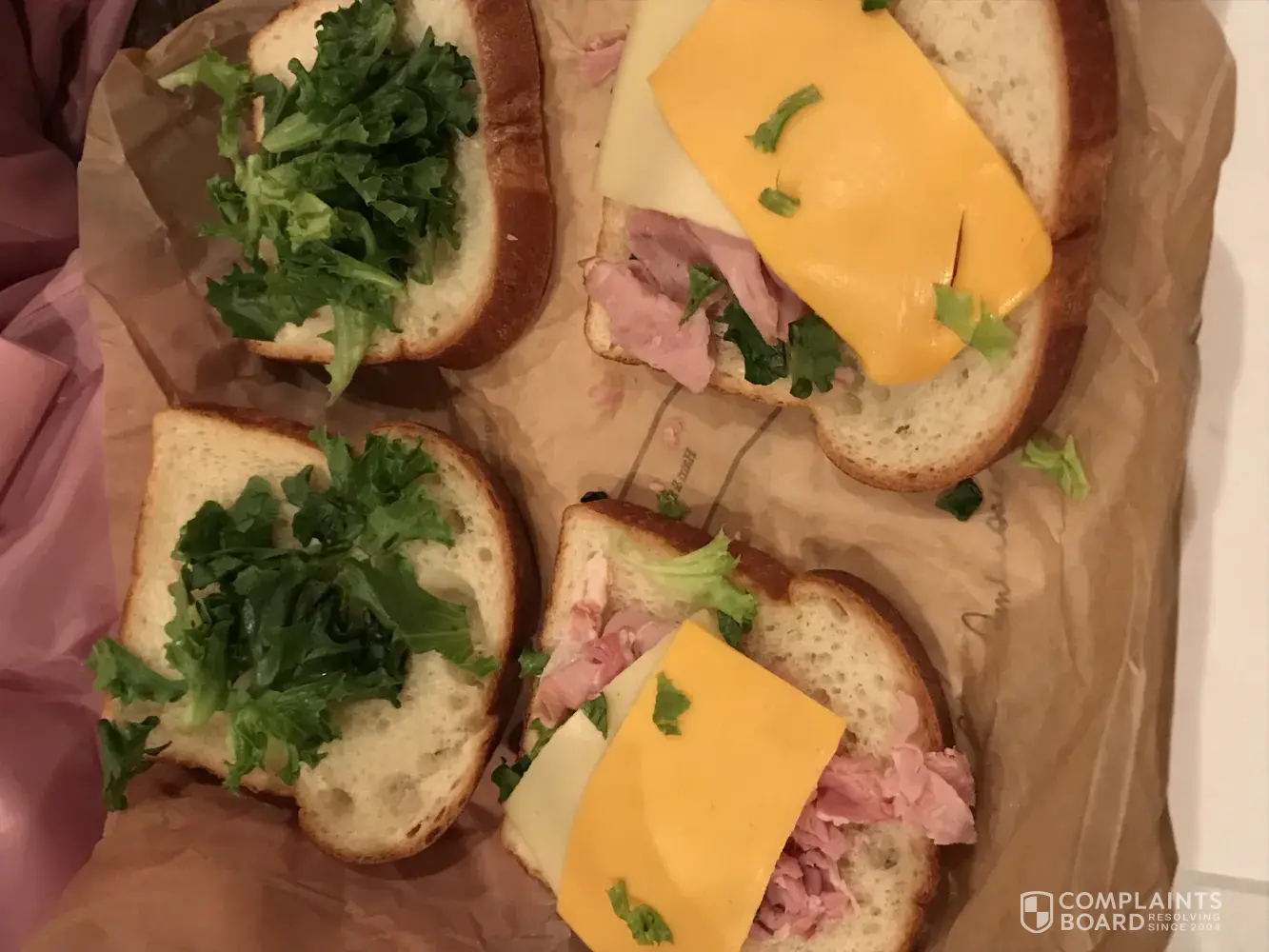 The sandwich was a joke. 2 white bread sandwiches with 1 piece of ham and 1/2 a slice of cheese on each with some lettuce. I asked for American cheese instead of Swiss and was up charged $1 and got 1 slice 1/2 a slice on each sandwich. The 1 slice of ham on each sandwich was mostly fat too. Did not eat it and I am very very unhappy. Cost me $8.79+tax my...