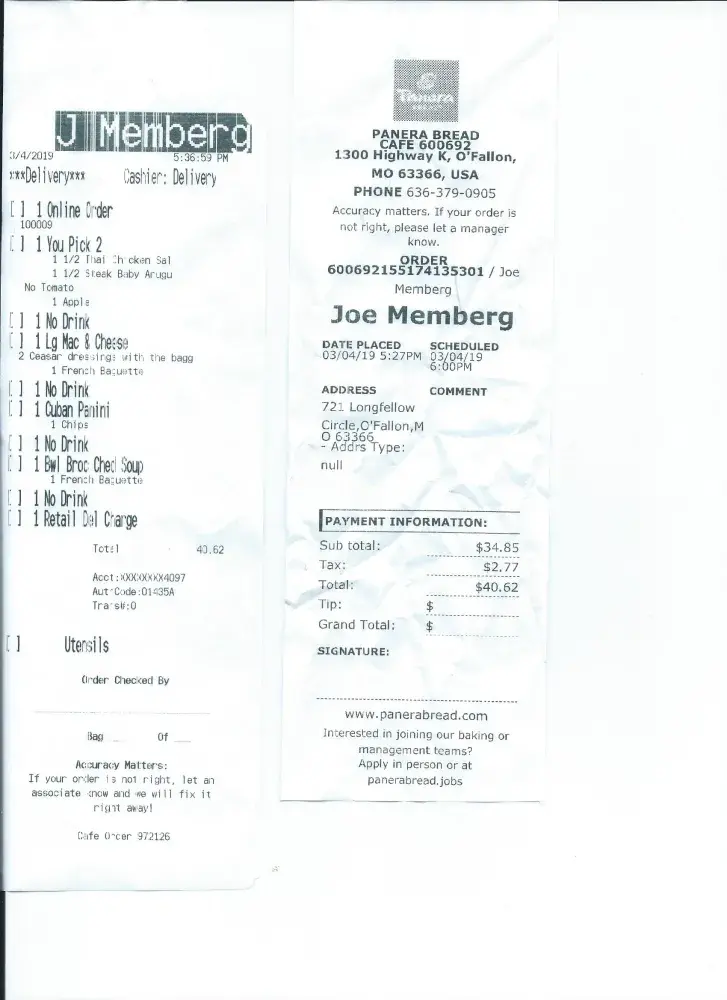 Panera Bread order of food on 4-27-2019 edina, minnesota panera bread