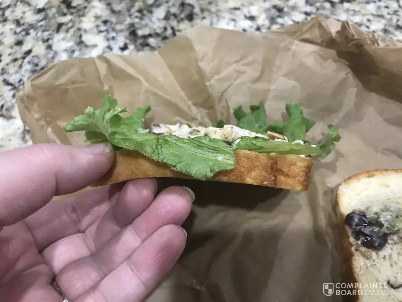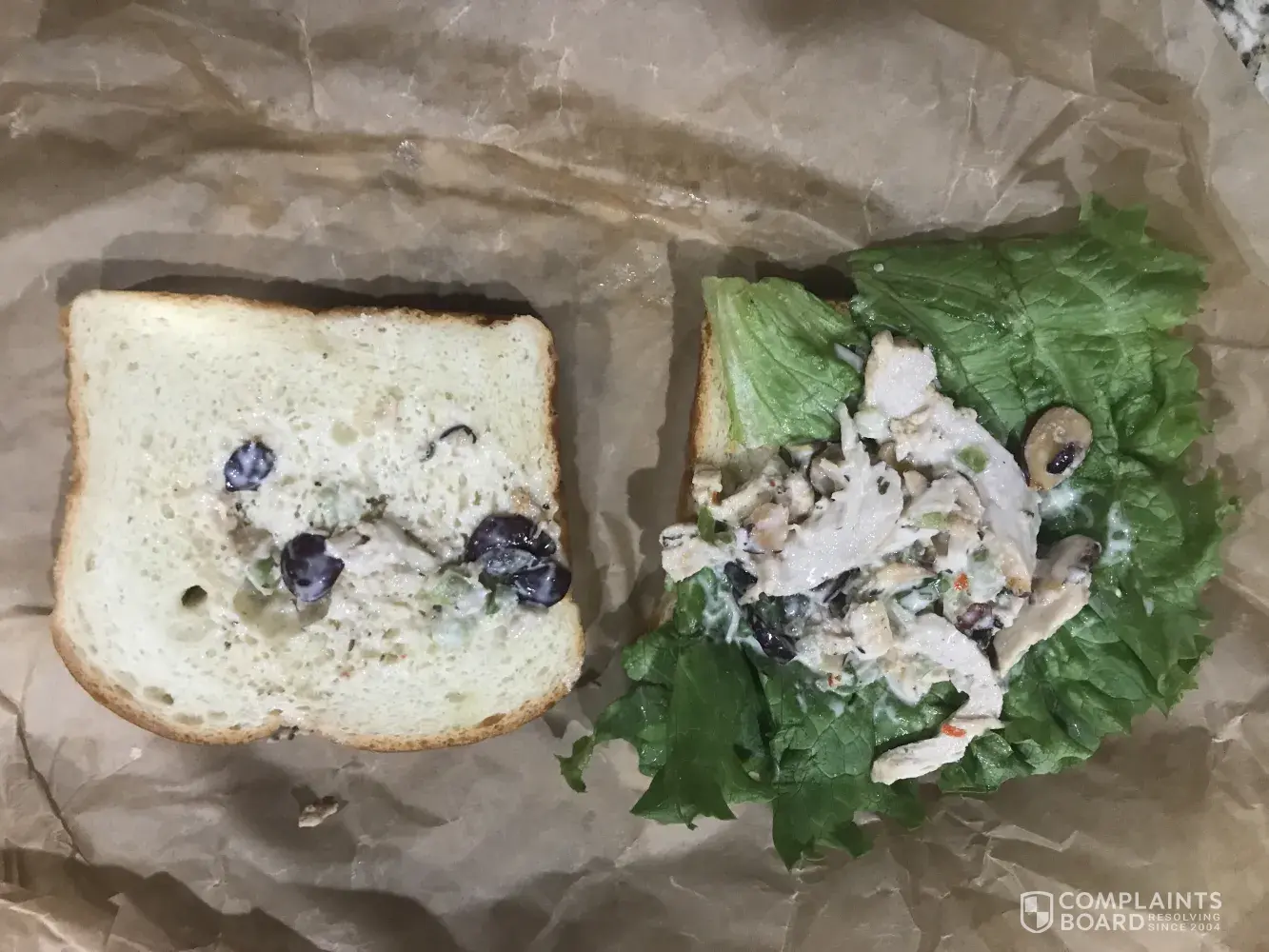 I ordered in Napa Almond chicken salad sandwich on white bread with no tomato through the drive-through at Panera bread. When I got home and opened up my sandwich there was hardly any of the chicken salad inside of it. I took a picture of it. It was maybe a table spoon of the chicken salad. The free pickle was more filling. I definitely overspent on this sandwich. Very disappointing ! I recently moved to Oklahoma from Kansas and the Panera In Kansas had much better made sandwiches.