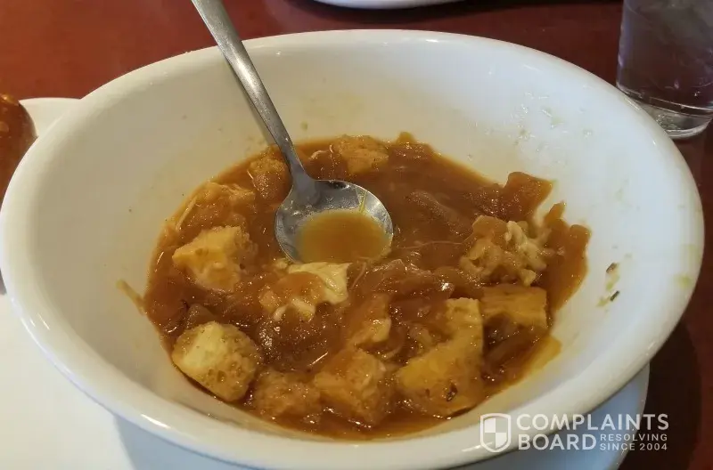 My son and I have been going to Panera for years. I hated it when you cheaped down the French Onion recipe to croutons and a bit of cheese, but still I came in to your store. Today we went to the Panera Bread Cafe 3382 Medina, Oh at 3:22 PM. I just broke both of my feet and am on crutches. Your bathroom leaves something to be desired when entering and exiting those heavy door. But that's not my biggest complaint. You now have large bowls which really makes your reduced portion sizes stand out, congratulations on that. I took a picture. So after eating what was there I was left with croutons and onions but no broth (isn't broth included in the soup, hence the term soup?) so I asked my son to take it up and just ask for another spoonful of broth. The girl (I'm sorry, if I had gone up there I would have her name, my son is much nicer than I am) was snotty and said that they were only allowed to give a certain amount. But she begrudgingly added some more broth and told my son that basically she gave him another bowl of soup. REALLY? BROTH? All I wanted was some broth to finish the rest of the crap in the bowl. I just wanted to let you know. I'll be sure to let others know as well on Face Book, Instagram and word of mouth. You now have a need to be competitive. There's other soup places out there and I guess now I will be taking my business to Zoup! as well as other places. Too bad since I have been a long term customer. Karen