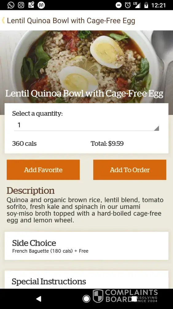 On Saturday, Jan. 20th, I ordered a lentil quinoa egg bowl through the App and was extremely disappointed! It was soup more than anything else...there's was zero lentil and quinoa in clusters! Definitely not enough food to compensate the $10. Why pay $10 for watery soup?! It's extremely important for food to look like the picture! Needless, to say this was an extremely disappointed experience with Panera in Orlando, FL.