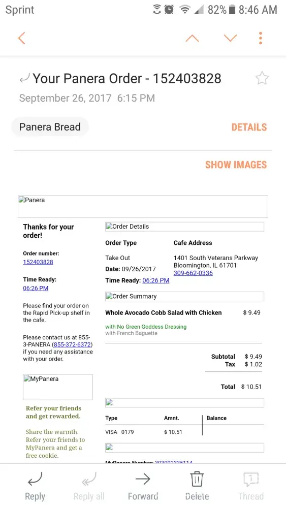 MyPanera Number: [protected] - When I placed my online order on 9/26/17 at 5:20 pm, I saw no way to say I wanted to use my Panera Reward, so I assumed it would be done automatically. It was not... very disappointing since the $5 reward expired yesterday and was the reason I did this online (I was sitting in the store at 1401 Veterans, Bloomington, IL, having been there for a meeting & purchased a caffe latte). I would appreciate this or some other reward be applied with a new date to My Panera card. I have the attached receipt. My total was $10.51.