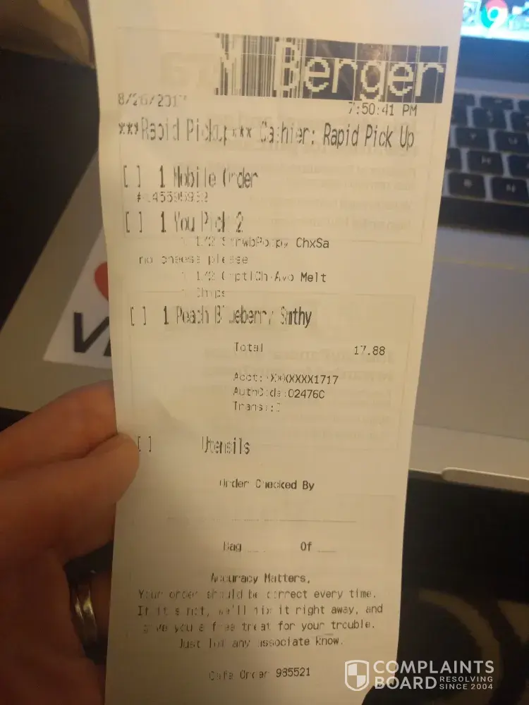 I called the manager, Betty. She said to come back & she would make new ones herself. It was late for my daughter, so she had a sandwich from home to eat. On my way back, I had to pull off the road & vomit my strawberry poppyseed 1/2 salad. I spent last night vomiting & 2 1/2 hours this morning at the doctors office. I've had labs & x-rays & I'm on a clear liquid diet.