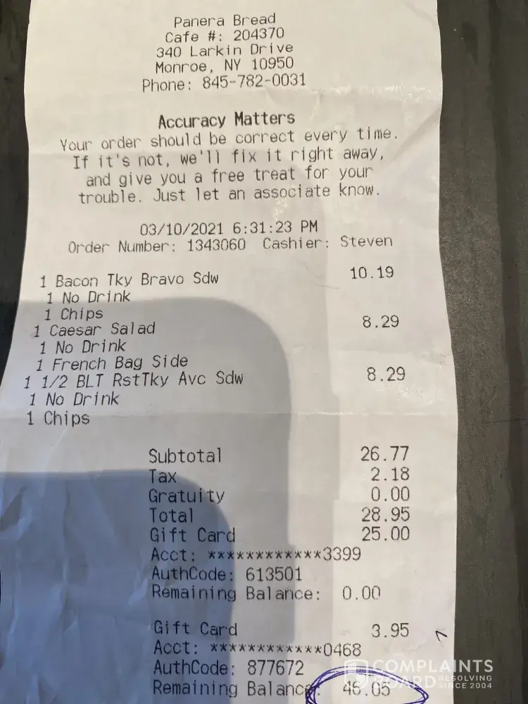 Read full complaintBeing charged for bread but always being given chips insted.