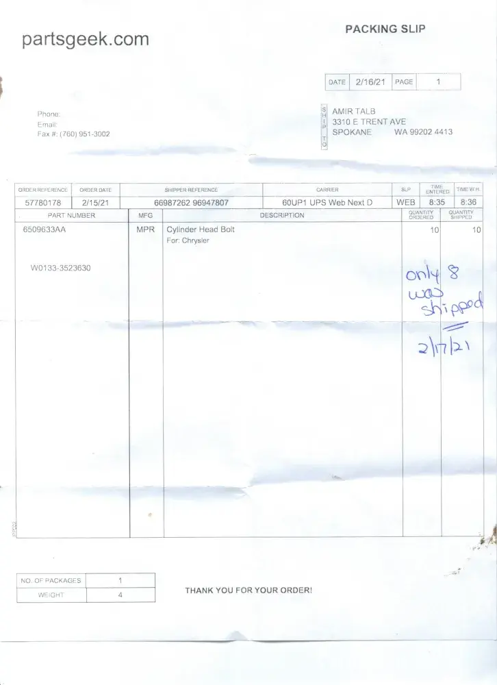 Parts Geek Parts order shipped incomplete