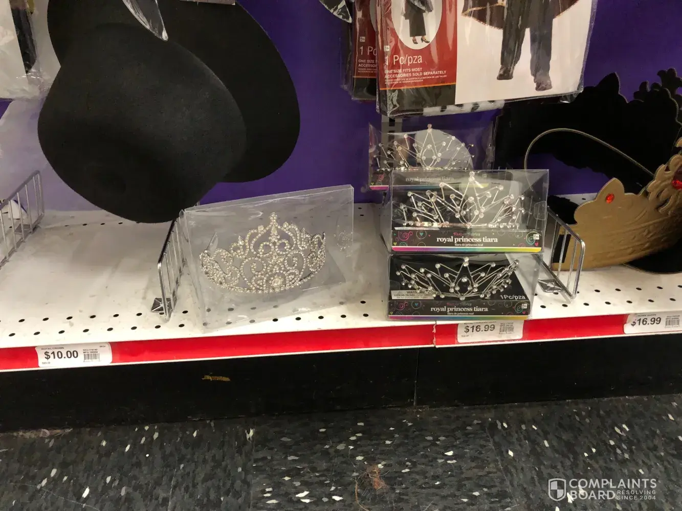 We have pictures of the tiara (on the left) my daughter wanted in a bin that said 16.99 and when we got to the register Johnathan rang it up as twice the cost. I told him the price on the shelf/bin was not that and he called the manager. The manager came out with a different tiara and said this was the cheaper one and that the one we had wasn't labeled yet...