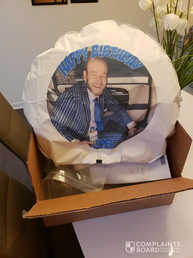 I ordered a personalized photo balloon online and it ripped when I attempted to blow it up with a helium machine. I cannot use a ripped balloon. It was for my boss on his birthday and now I have nothing to give him and I was left with the responsibility to do so. I even paid for UPS 2nd Day Air which was an additional $19.99. Order number [protected]-1