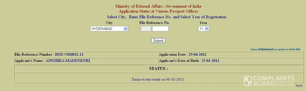 I applied for my daughter's passport on 29th April 2011 under Tatkal Scheme at the Regional passport office in Hyderabad. As per the acknowledgment and update from the staff the passport was ready on 6th May 2011. THe status on the website also shows the same. But the dispatch of passport has been delayed. I request the concerned passport authorities to look into this matter, as I had to leave my daughter back in India, and travel to UAE to join work., as there is a delay in dispatch of her passport. We cannot reach any mode of communication to get any update (sms, website, RPO Hyd or the enquiry numbers)
